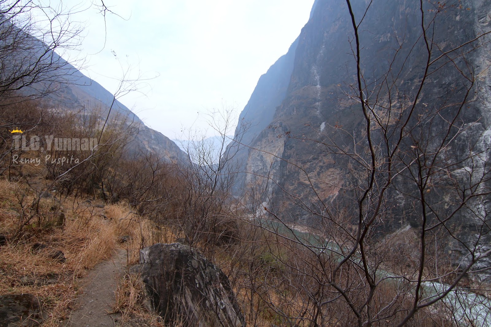 Tiger Leaping Gorge, nama ngarai ini unik ya? mungkin dilihat dari bentuk lembahnya yang sangat sempit sehingga harimau bisa lompat dari satu sisi ke sisi lain dari sungai. Ketika musim hujan, arus air di lembah sempit ini mengalir dengan deras dari sungai JinSha, misalnya karena hujan besar.