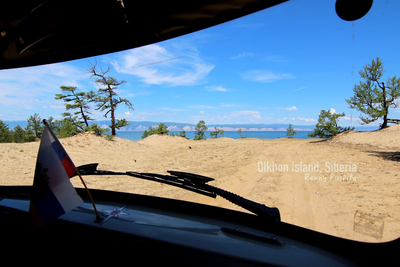 Besok paginya kami menikmati keindahan Danau Baikal dengan mengikuti one day tour Pulau Olkhon dengan biaya 800 Rubble sudah termasuk lunch, tapi belum termasuk tiket masuk taman nasional yaa... yaitu bayar lagi 60 Rubble. Dengan mobil semacam Jeep buatan Rusia yang bentuknya seperti mobil combi VW dan jalannya tangguh melewati jalan tanah berpasir di Pulau Olkhon, dari sini kita dapat menikmati view Danau Baikal dari berbagai penjuru Pulau Olkhon. Sangat indah!😍